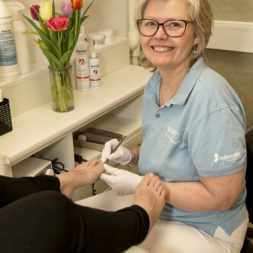 En fodbehandling består i; Klipning, fræsning og oprensning af negle, beskæring af hård hud og ligtorne. Behandlingen afsluttes med negleolie og creme.